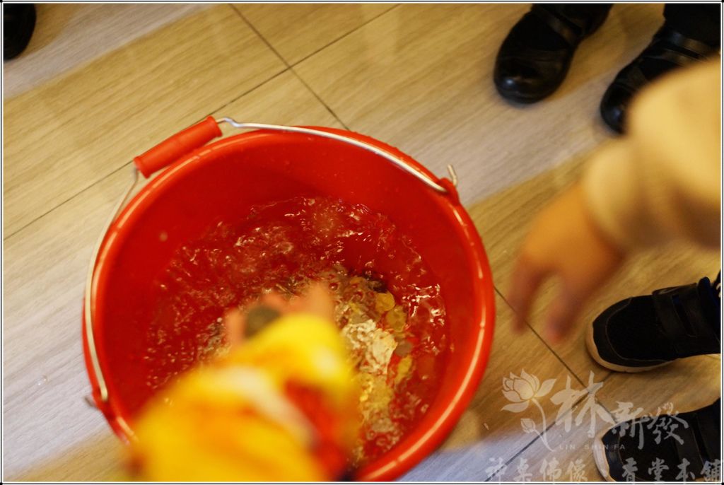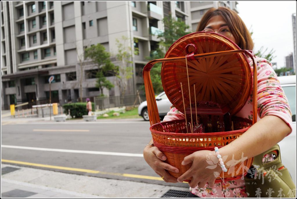 再來裝謝籃,要保護的穩當,祖爐下面倫師請客人準備了一個紅壓了財寶,要給祖先帶財寶到新家