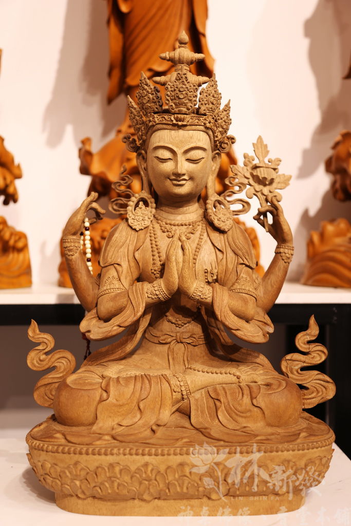 四臂觀音與千手千眼觀音均為觀世音菩薩的其中一種應化身,身著綢緞及纓絡。前兩臂合掌當胸並持如意寶珠。後兩臂高舉至肩,