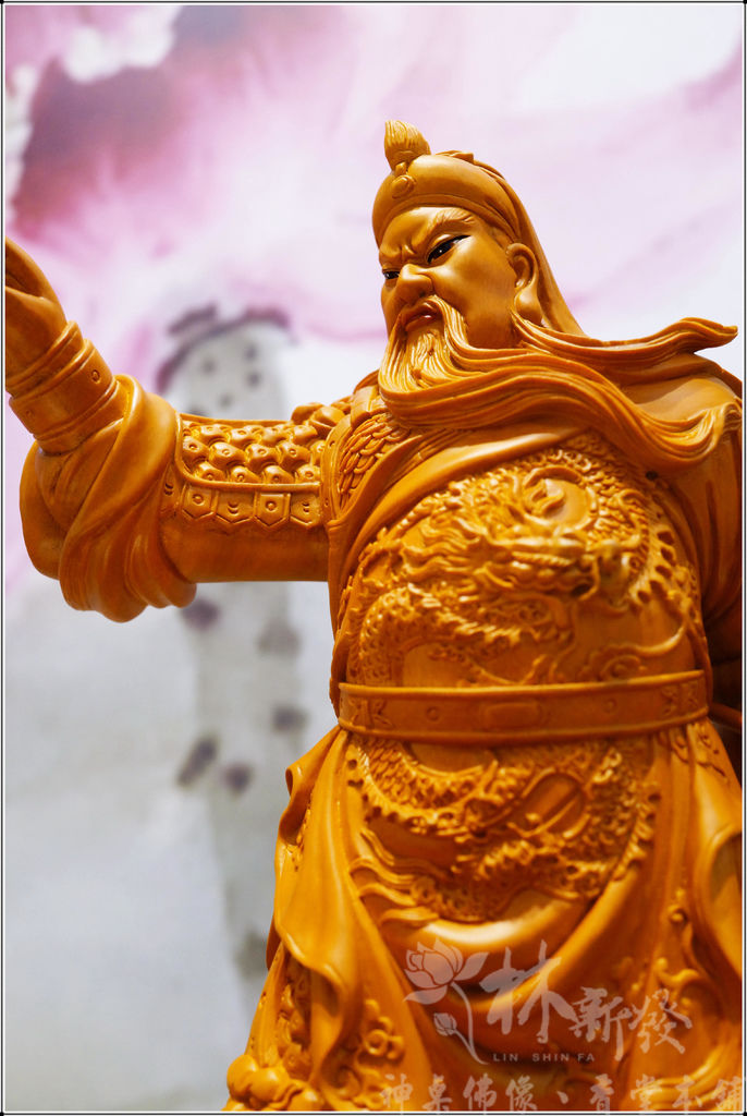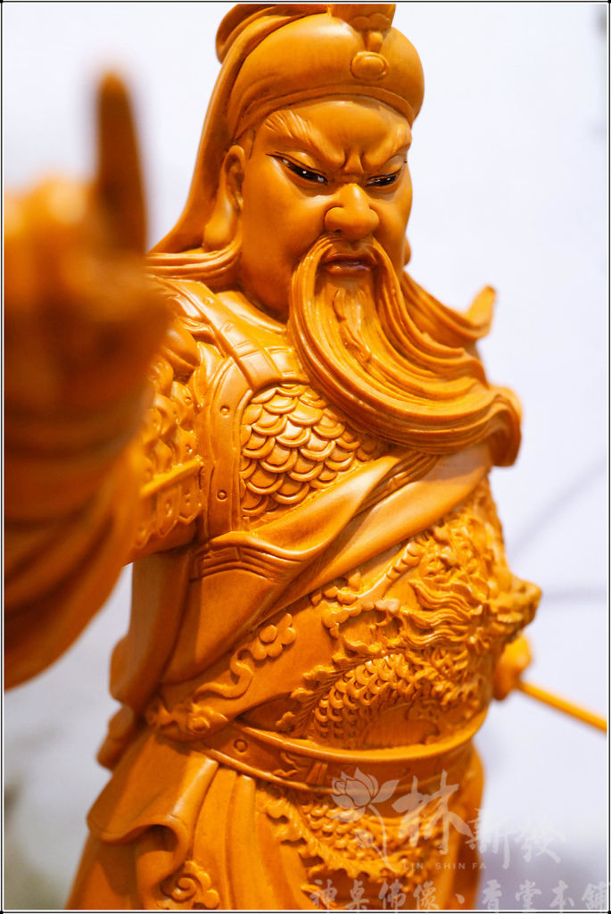 當時參考照片是一件大尊的銅雕帝君,倫師想呈現威武的力量,因此更加強關公的力度喔~