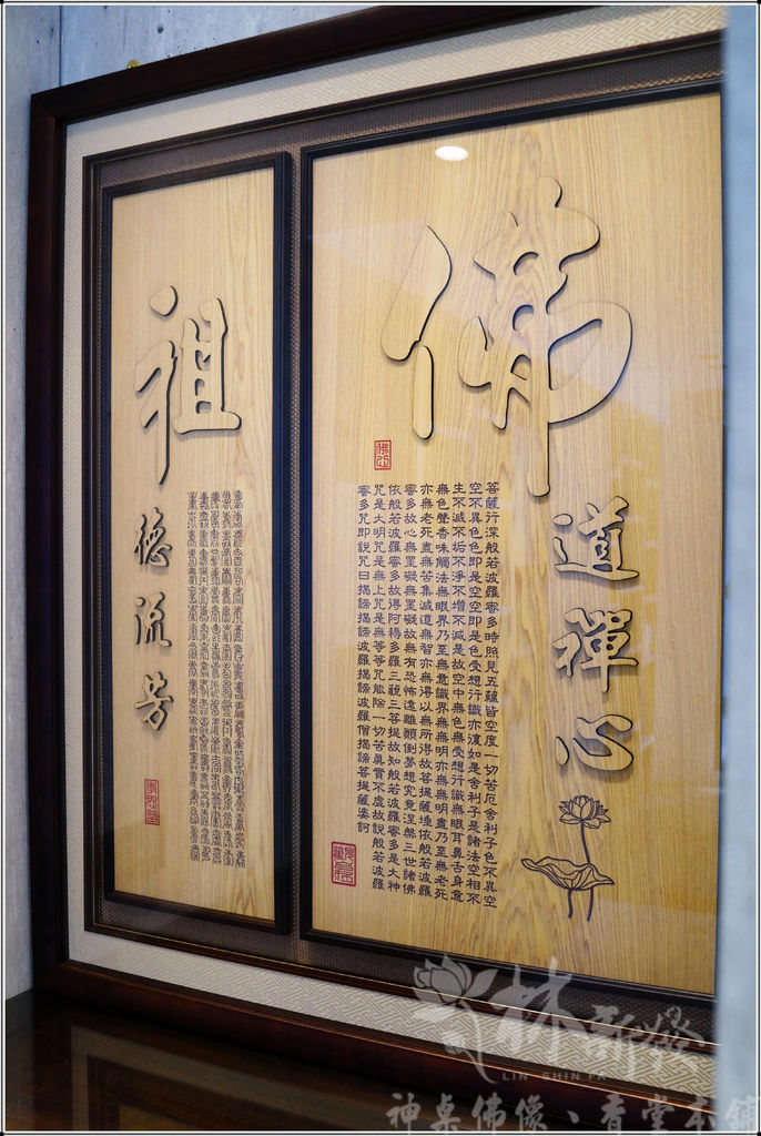 上面的佛道禪心跟祖德流芳都是檜木全實木陽雕,跟現代佛堂設計有完美的融合喔!請大家一起來欣賞!
