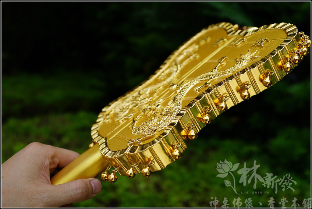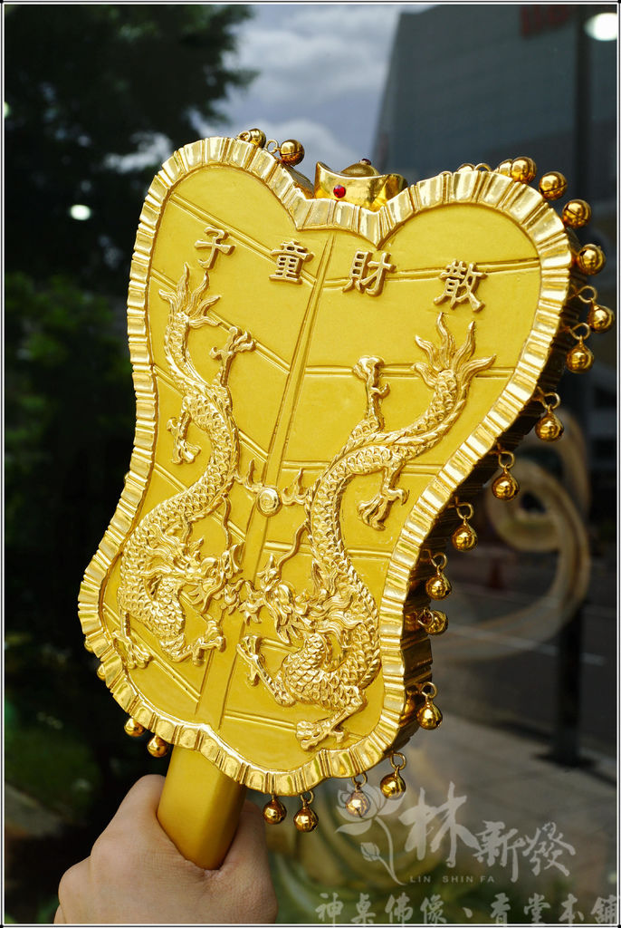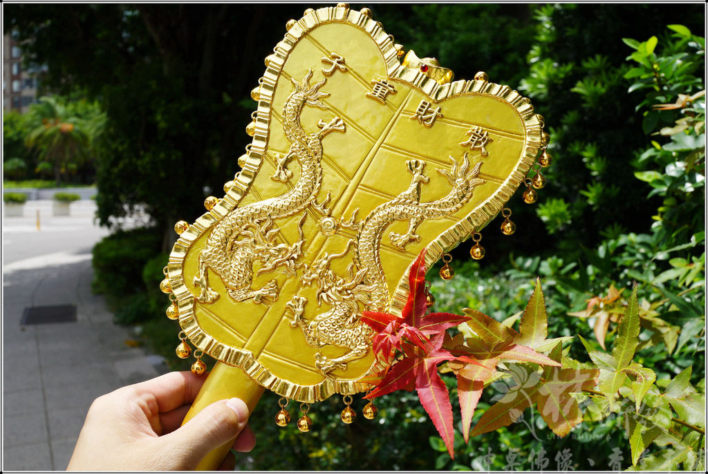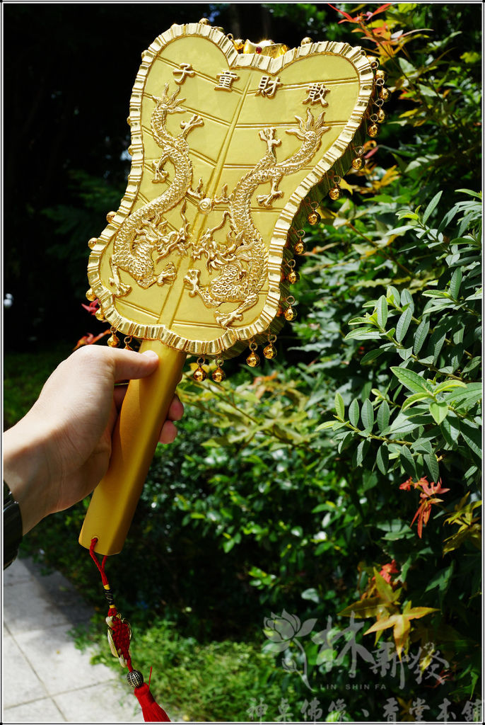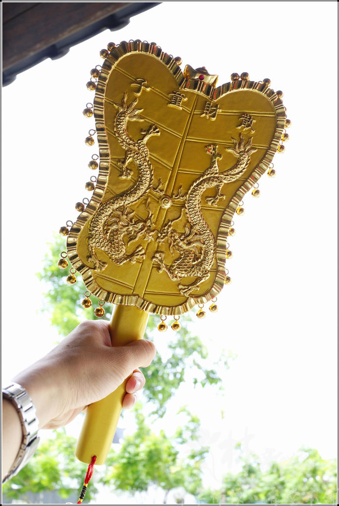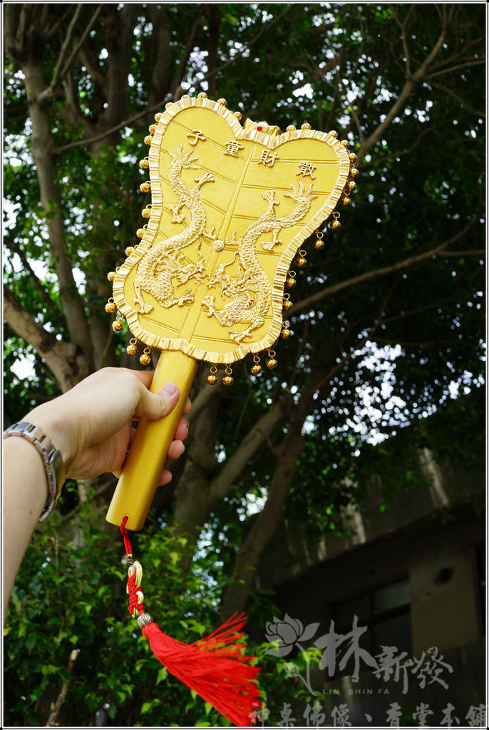 特別訂製的手工法器是整塊木材一體雕刻完成的喔!神明旨示要完成雙龍芭蕉扇,