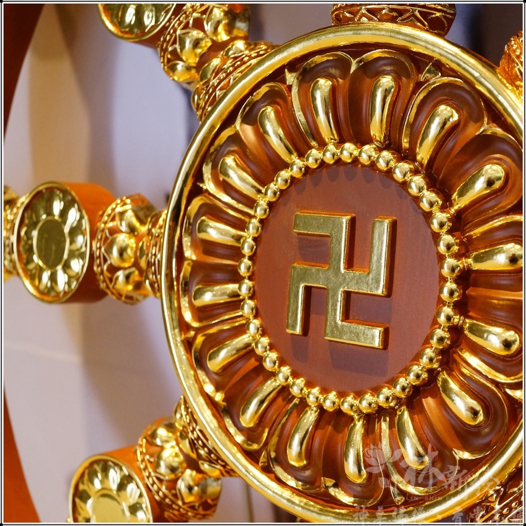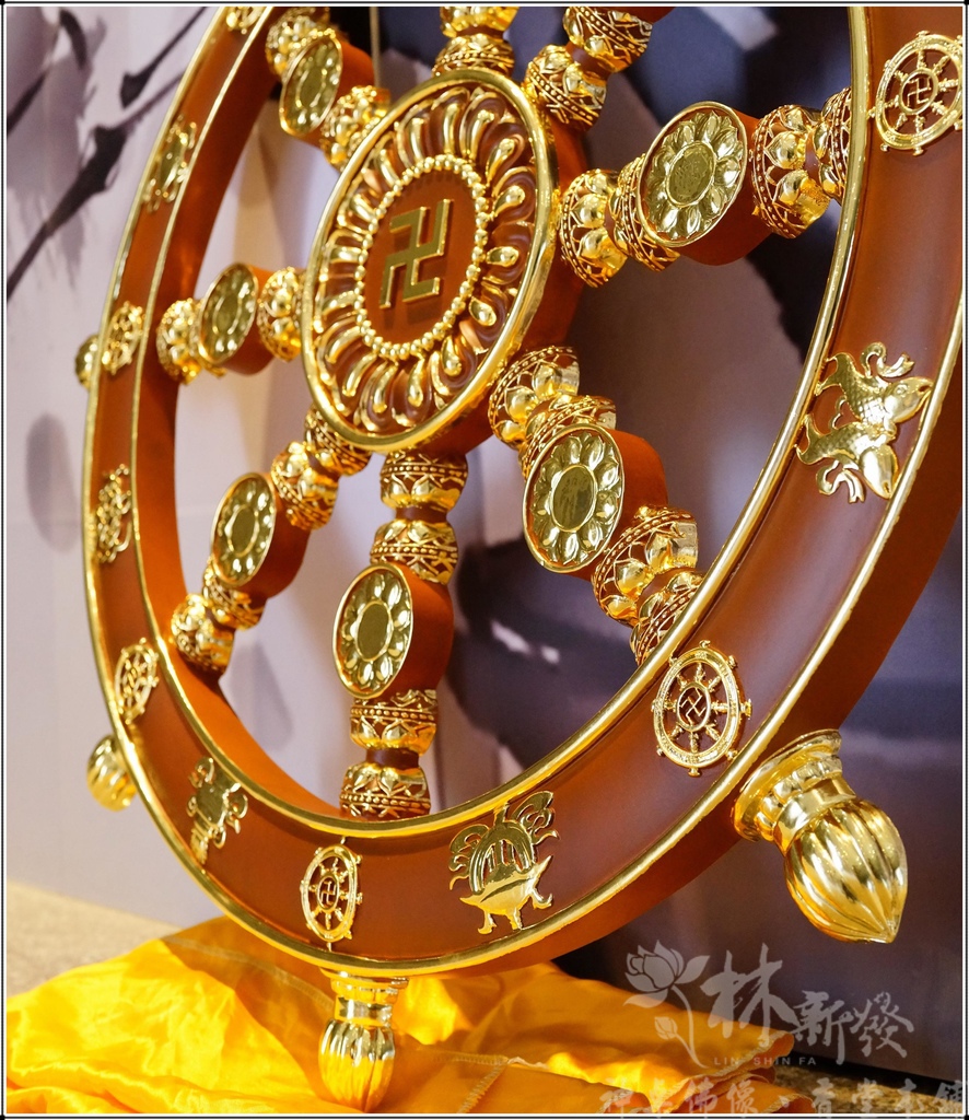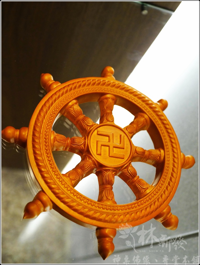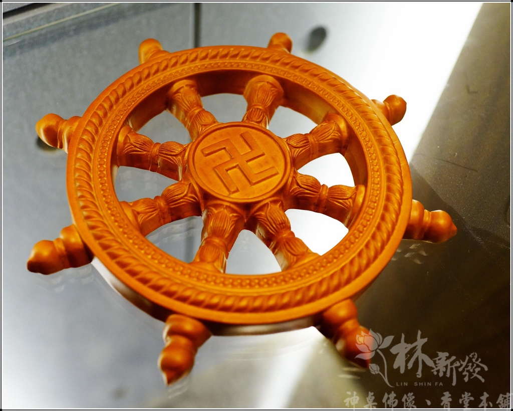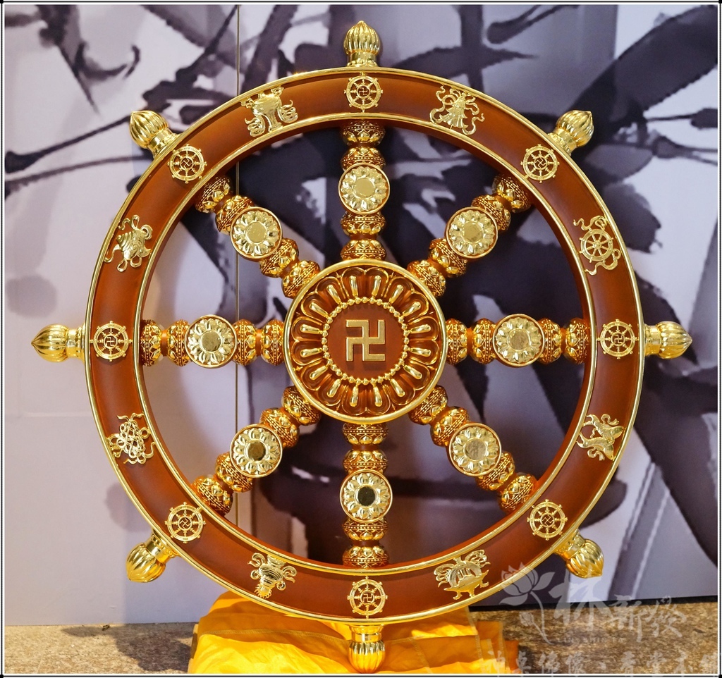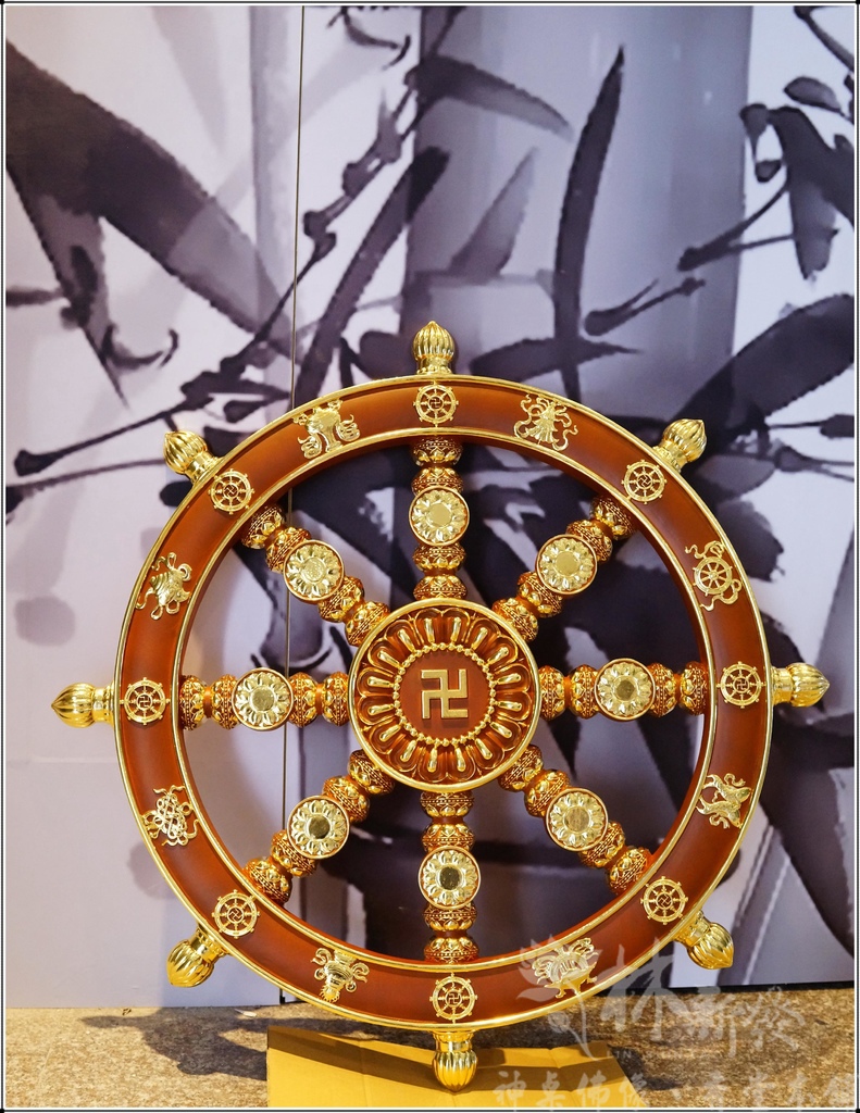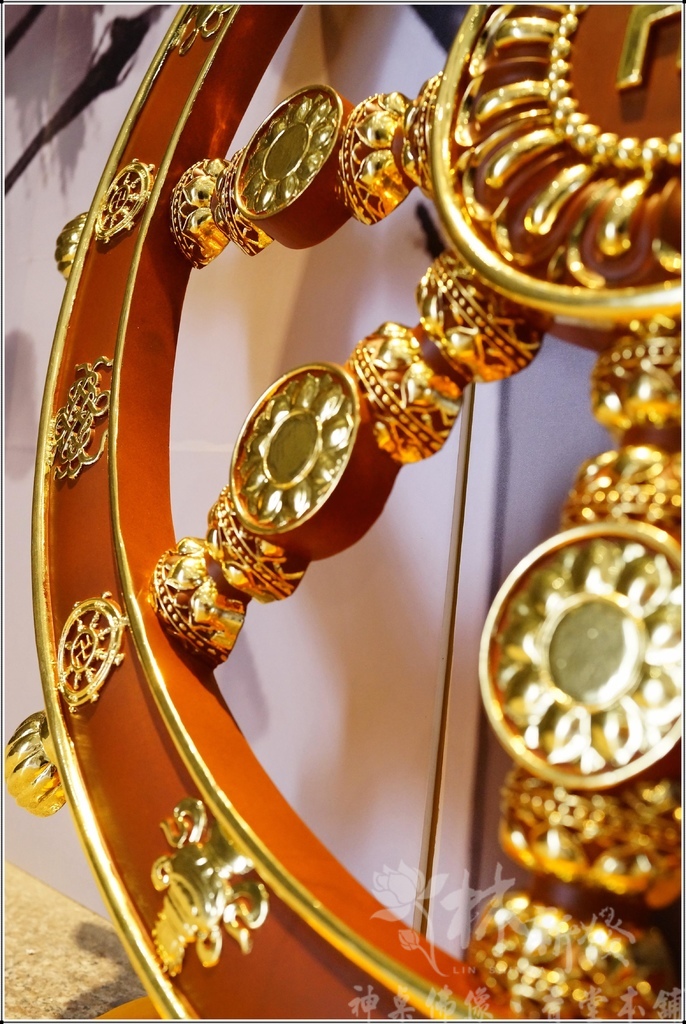第一張是88公分描純金法輪,第二張小法輪是只有22公分直徑喔!再來是直徑60公分左右,題為了佛堂設計而製做的萬法八吉祥法輪。