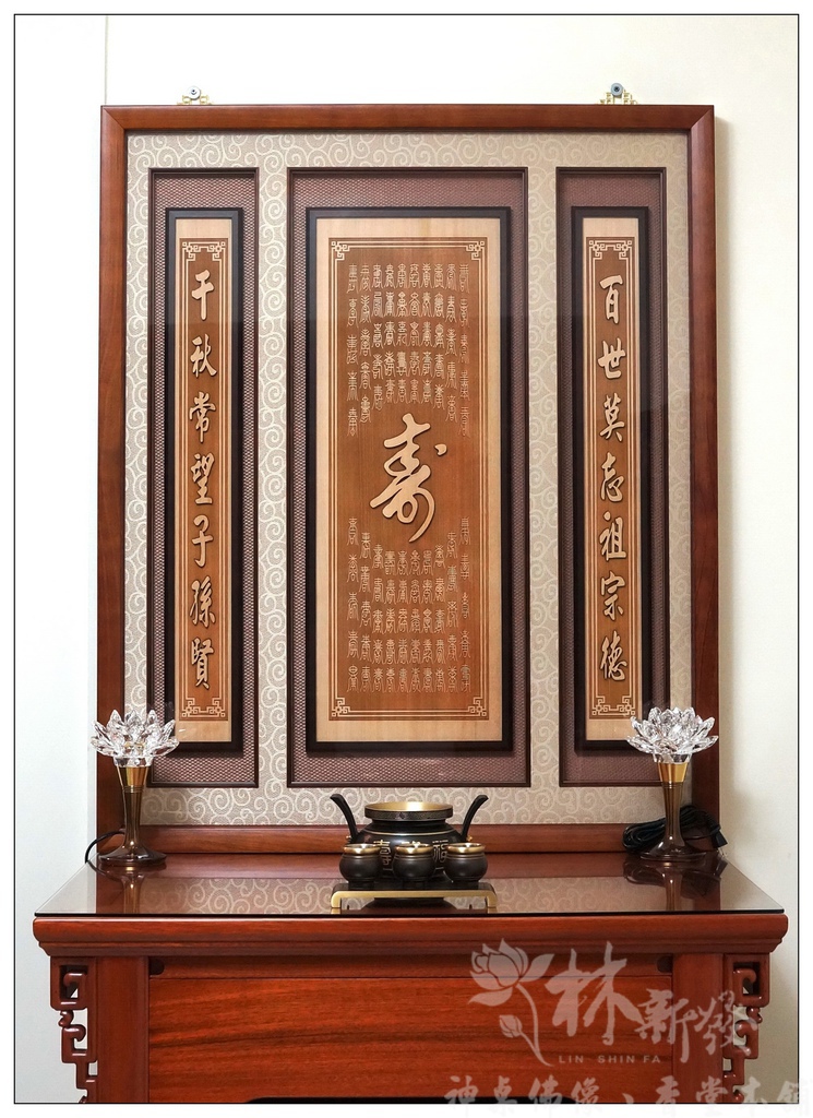 佛堂設計-二尺九黃金檀騰達如意神桌(壽字浮雕百壽祖先聯-百世莫忘祖宗德、千秋常望子孫賢)